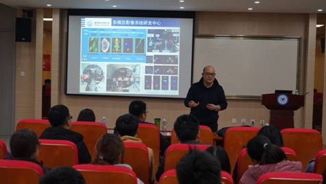 随后,由先进医学影像团队各位老师向同学们一一介绍各自研究领域的相关内容和发展前景。陈雪利教授代表先进医学影像团队详细介绍了先进医学影像团队的团队建设与团队理念等基本情况,并就教学和科研成果以及人才培养方式进行了展示。梁继民教授针对肿瘤分子成像原理与实现方法做了详细介绍,主要涉及到传统的基于半监督和弱监督图像分割和目标检测、脑机融合的认知机算,以及现阶段热门的基于深度学习的斑块检测和心肌功能评价等。詹勇华副教授和许欣怡老师重点介绍了无机-有机杂化纳米材料联合运载基因药物和化学药物的研究方向,并对现有的利用两种氨基酸-β-环糊精修饰的量子点作为药物载体实现同时运载靶向多耐药基因MDR1的siRNA以及化疗药物阿霉素进入细胞的研究成果进行了详细说明。
