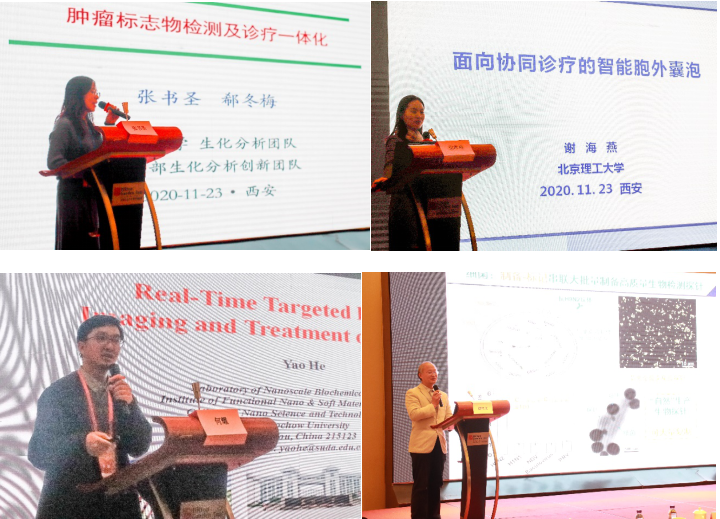 上午9时许,大会特邀报告正式开始。来自临沂大学的博士郗冬梅女士,苏州大学的何耀教授,南开大学的庞代文教授、湖南大学的张晓兵教授、北京化工大学的汪乐余教授分别作了题为“肿瘤标志物检测及诊疗一体化研究”、“Real-Time Fluorescence Imaging of Retina Disease”、“量子点单病毒动态示踪”、“荧光探针性能调控与成像应用”以及“多功能纳米探针用于活体深度组织多模成像分析”的报告,并进行了提问环节,为师生答疑解惑,深入交流。