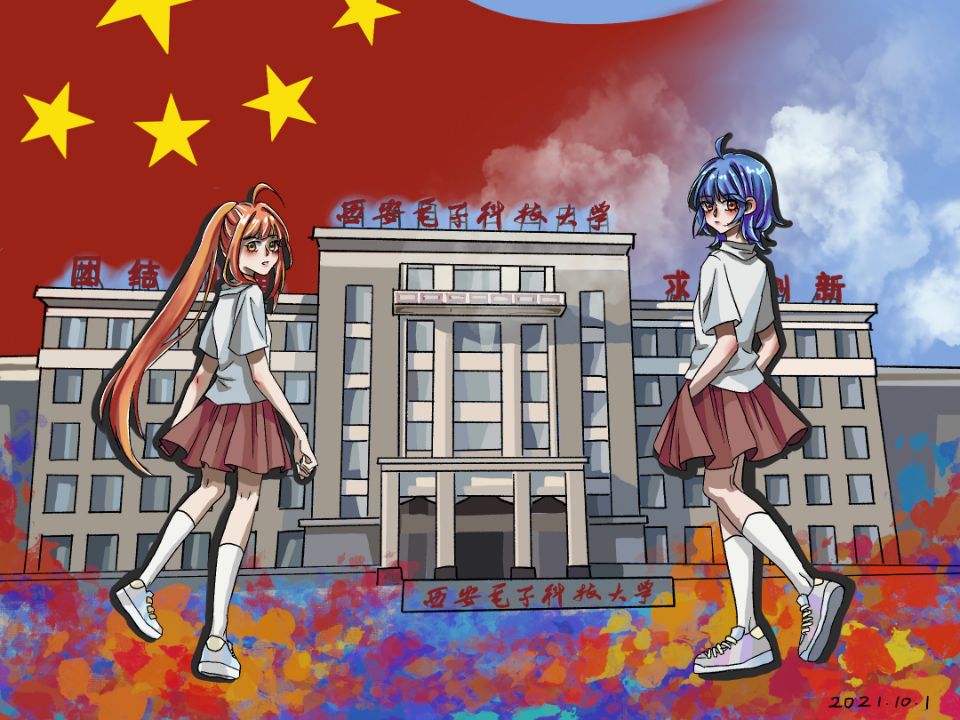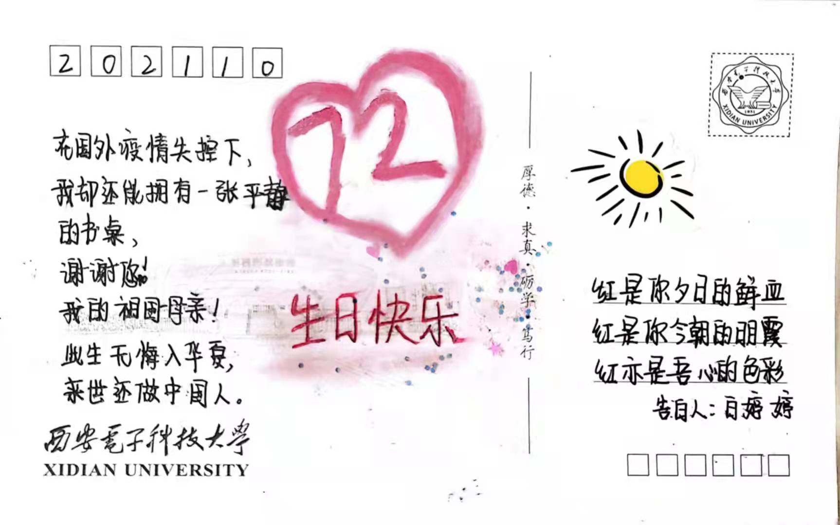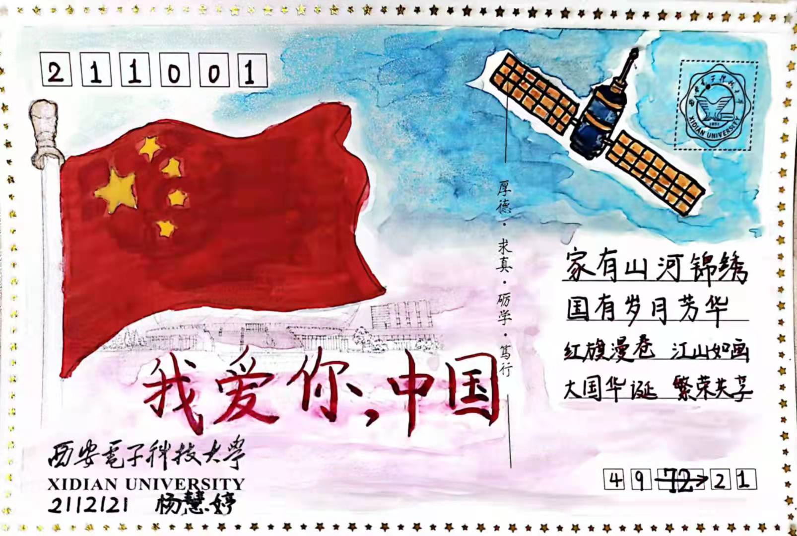 在与国旗合影之余,同学们在带有西电地标性建筑的明信片上写下了对祖国的美好祝愿,向祖国深情告白。
