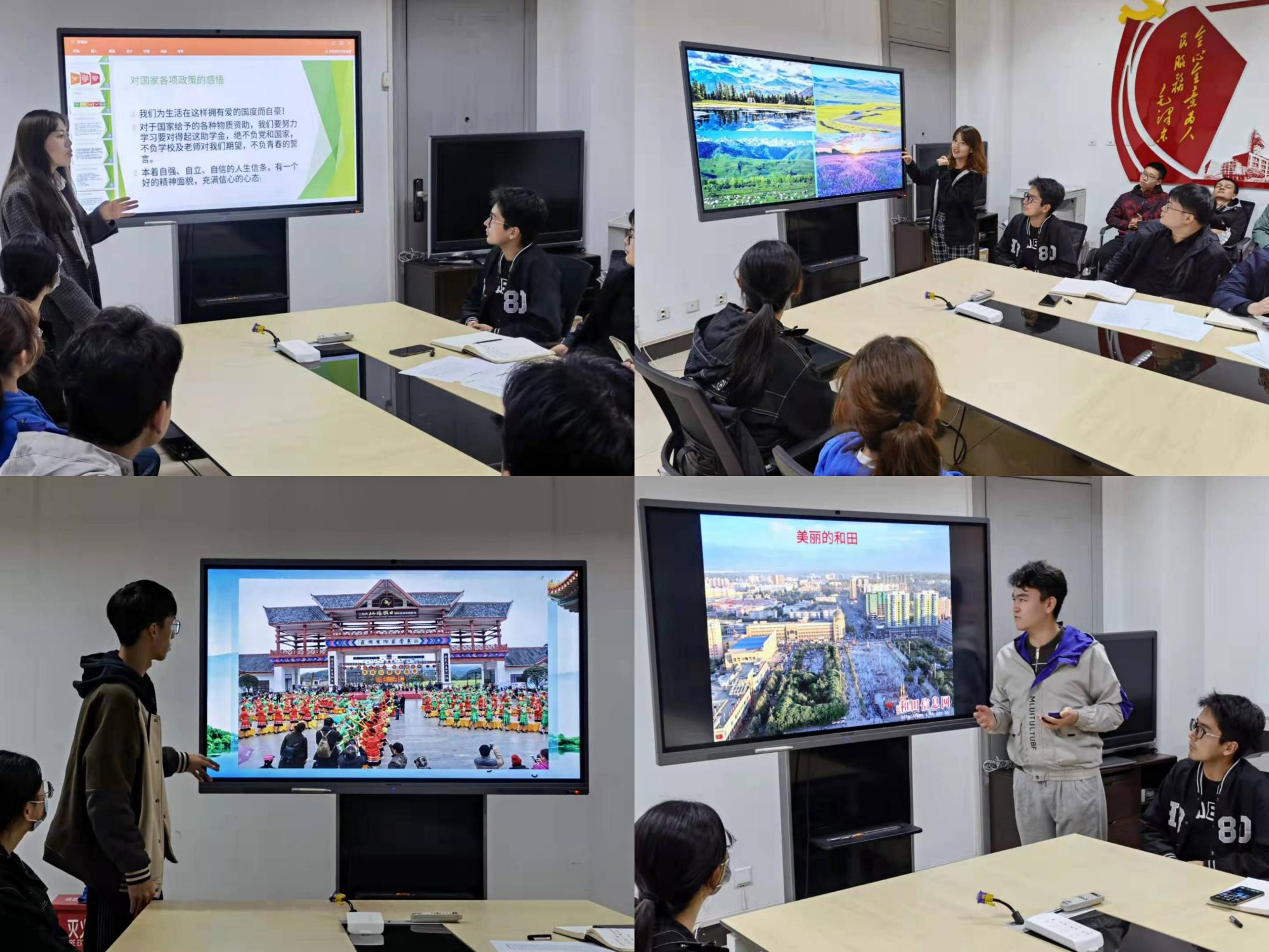 在交流环节,不同年级、不同民族的同学依次发言。18级巴依彦同学通过介绍自己的学习生活情况,表达了对学校、学院的感激之情;19级马兰同学分享了家乡的地域特色、在校学习生活情况、未来的职业规划等;20级的玉苏普江就民族风俗传统、家乡基础设施等方面的发展变化谈了自己的看法;21级的訾艺婷和韦淇嘉介绍了个人的成长经历及家乡的风俗风貌等。参会其他同学也就自己关切的问题与大家进行了交流。