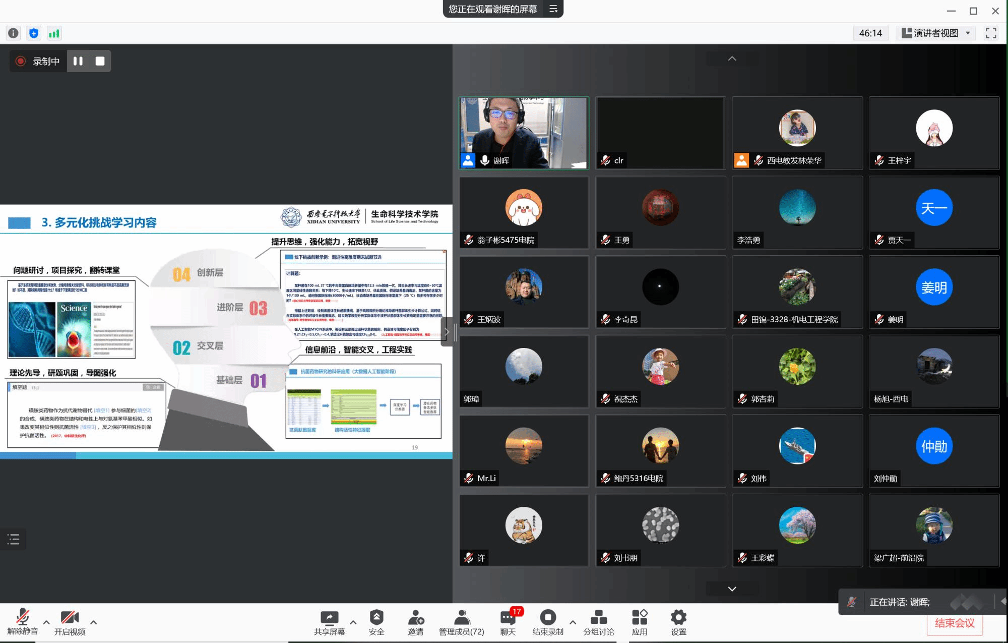 据悉,2021年8月,经个人自主申报、学校综合评审等环节,谢晖副教授主讲的《现代工科微生物学》课程被学校遴选为6门优质示范课之一。目前示范课观摩班项目经过三个多月的开展,获得了观摩学员的一致好评。