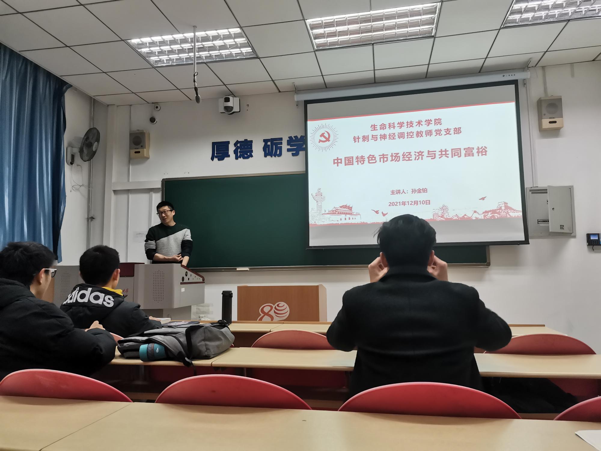 为加强对习近平新时代中国特色社会主义经济思想的理解,2021年12月10日下午,孙金铂老师于信远楼I区106教室,为生科院大二部分学生和针刺与神经调控研究生党支部全体党员与积极分子上了一堂题为“中国特色市场经济与共同富裕”的党课。