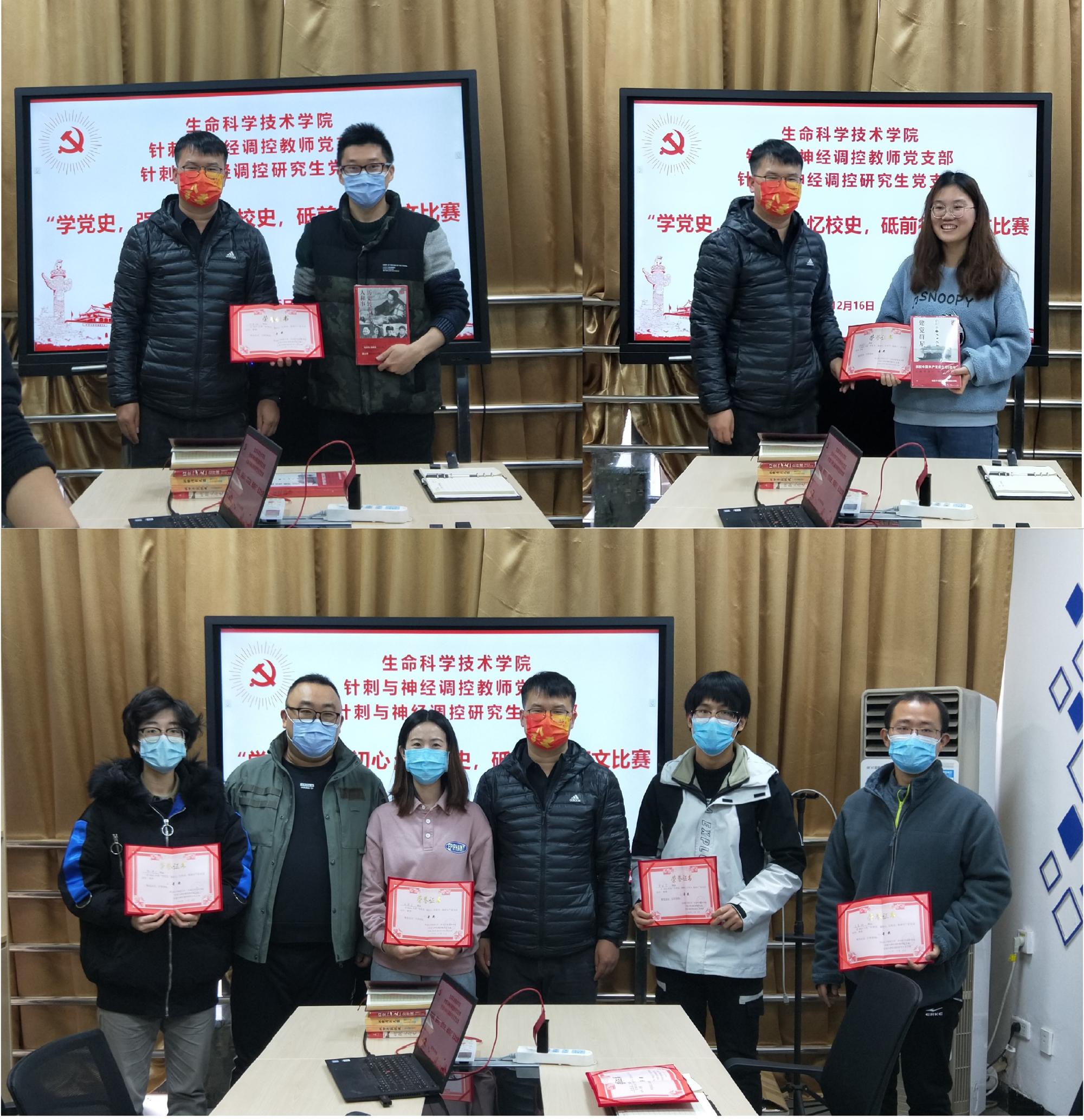 随后,刘鹏书记邀请李卫帮副院长参与“学党史,强初心;忆校史,砥前行”有奖征文的颁奖仪式。该活动由针刺与神经调控教师、研究生党支部发起,以党史、校史为主题,邀请全院师生结合自身工作学习,悟感想、谈梦想。本次征文共收到投稿22份,最后评选出一等奖两名,二等奖四名。