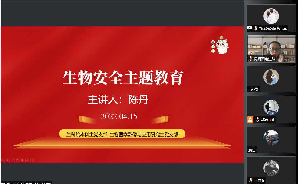 其次,为深入学习贯彻落实习近平总书记“把生物安全纳入国家安全体系”重要论述,让同学们更直观地理解生物安全相关知识,培养同学们对专业的兴趣,4月15日下午,304am永利集团官网本科生党支部联合生物医学影像与应用研究生党支部举办生物安全教育主题线上讲座,永利集团官网陈丹老师担任主讲嘉宾,会议由辅导员郭瑞主持,共计70余人线上参会。