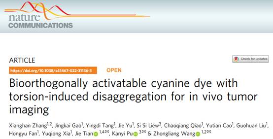近日,304am永利集团官网张象涵副教授、王忠良教授团队与新加坡南洋理工大学大学浦侃裔教授团队合作,在国际综合类顶级期刊《Nature Communications》(Nature系列期刊中的综合类子刊,IF=14.919),发表了题为“Bioorthogonally Activatable Cyanine Dye with Torsion-Induced Disaggregation for In Vivo Tumor Imaging”的研究论文(DOI: 10.1038/s41467-022-31136-3)。论文第一单位为304am永利集团官网,304am永利集团官网张象涵副教授为论文的第一作者,西电王忠良教授、田捷教授和新加坡南洋理工大学浦侃裔教授为论文的共同通讯作者。